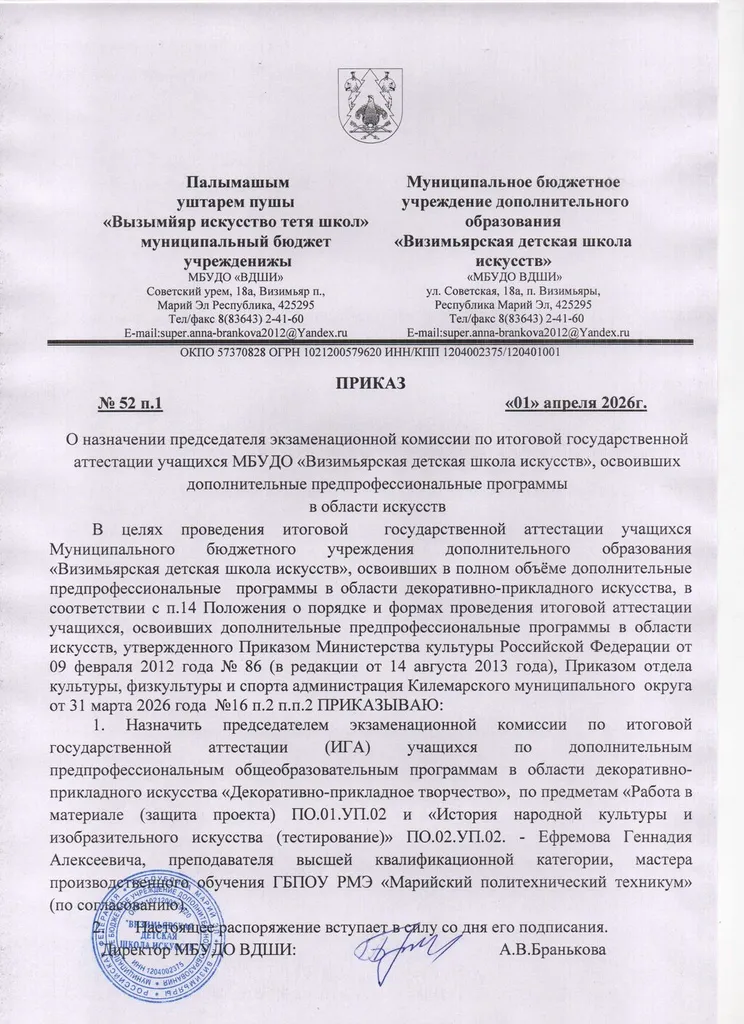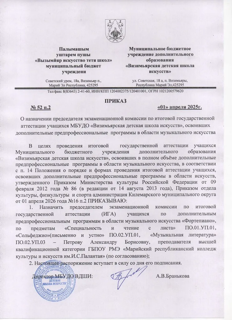 Приказы о назанчении экзаменационных комиссий по итоговой государственной аттестации, освоивших дополнительные предпрофессиональные программы в области искусств в 2025-2026 году